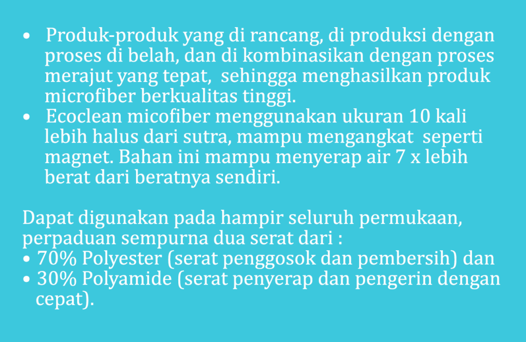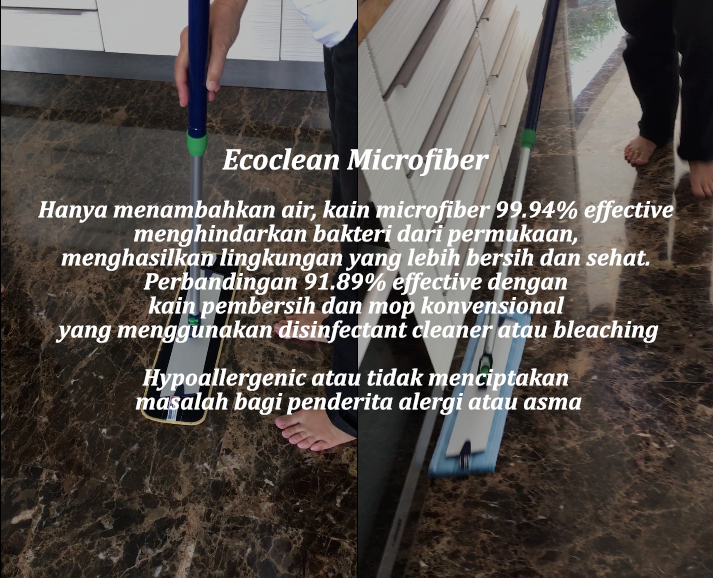 Hanya menambahkan air, kain microfiber 99.8% effective menghindarkan bakteri dari permukaan, menghasilkan lingkugan yang lebih bersih dan sehat. Perbandingan 91.89% effective dengan kain pembersih dan mop konvensional yang menggunakan disinfectant cleaner atau bleaching.
