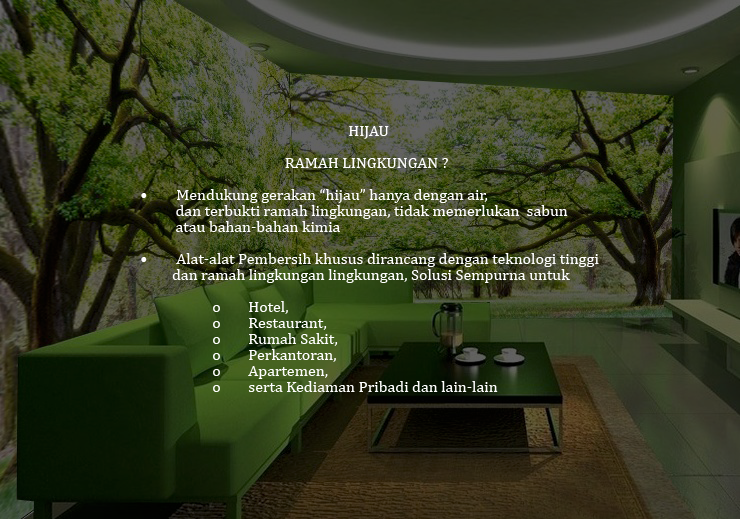 Mendukung gerakan “hijau” hanya dengan air, dan terbukti ramah lingkungan, tidak memerlukan sabun atau bahan-bahan kimia.